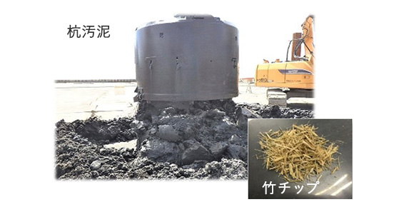 杭汚泥に添加するセメント系固化材を竹チップに置き換えることで、セメント系固化材由来のCO2排出量を削減します。 -