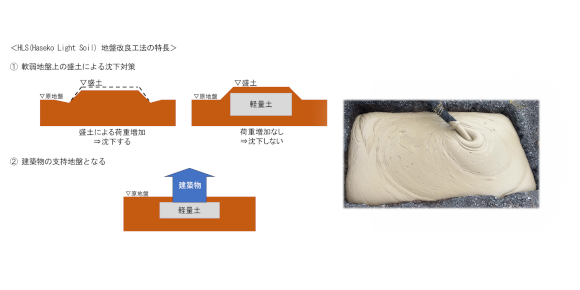 土に水、固化材、気泡を混合した軽量土を活用した地盤改良工法です。 -