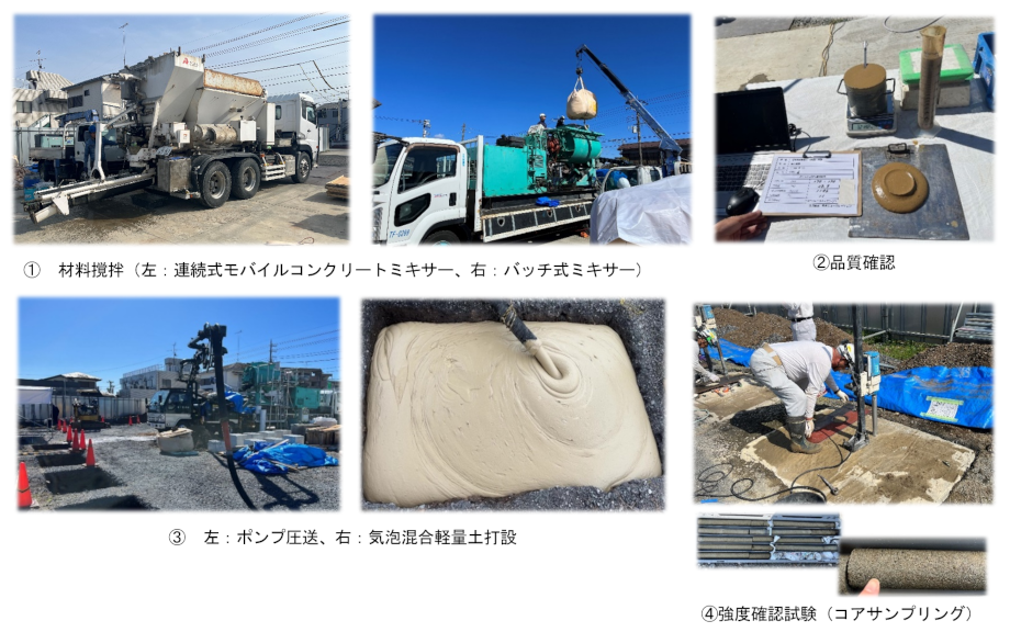 ① 建設現場で発生する土と、水、固化材、気泡を混合し、連続式モバイルコンクリートミキサーまたはバッチ式ミキサーにて材料を撹拌し、気泡混合軽量土を製造。