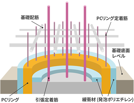 キャプテンパイル工法は、プレキャストコンクリート製のリング(PCリング)を杭頭にかぶせ、杭と基礎とを接合する工法です。杭頭接合部を半固定化することにより、地震時の杭頭部応力を低減させ杭の損傷を少なくできます。