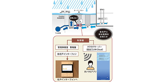 センサー付逆流抑止桝が,住戸に設置されたインターホンやクラウドを介して排水管の状況をお知らせするシステムです。 -