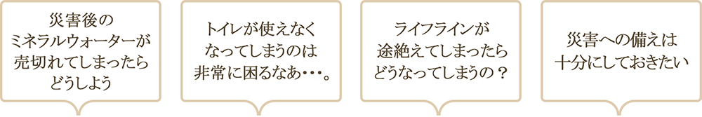 災害後の生活基盤を確保するために必要な水、トイレ、火を確保するための防災設備として、“非常用飲料水生成システム”“非常用マンホールトイレ”“かまどスツール”の「防災3点セット」を提案しています。