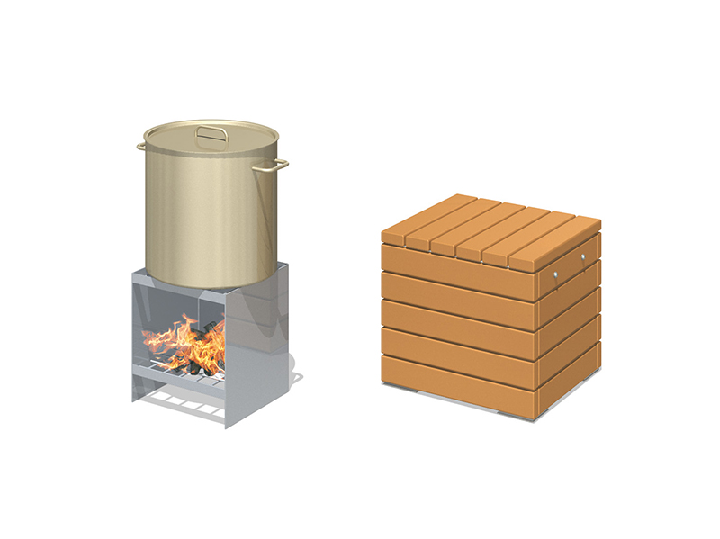 ふだんは上部を腰掛け板で覆っていて屋外用スツールとして利用でき、災害時には腰掛け板を外すだけで、炊き出しかまどとして使用できます。