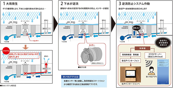 逆流抑止桝にセンサーを設置し,排水管の逆流情報を感知。住戸に設置されたインターホンやクラウドを介して排水管の状況を入居者にお知らせできるシステムです。