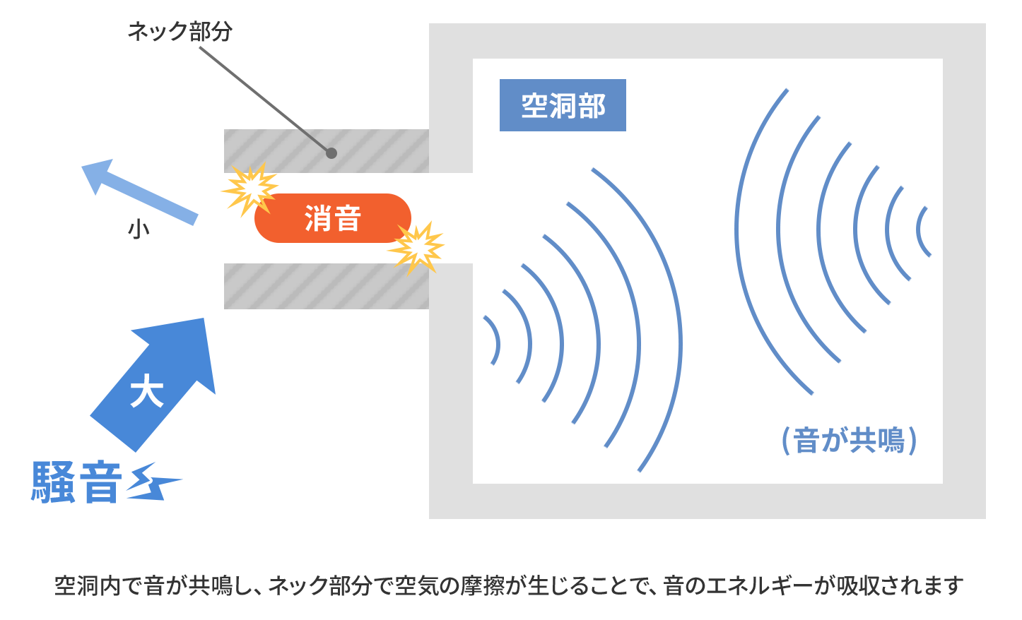 自動車のマフラーの消音技術を応用し、ヘルムホルツレゾネータによる共鳴の効果で音のエネルギーを吸収します。