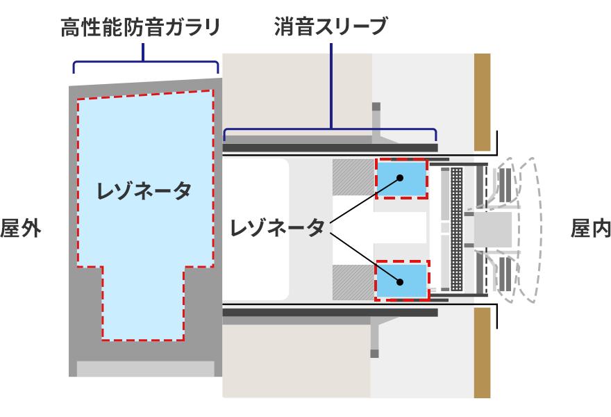 レゾネータと吸音材の組み合わせにより、遮音効果と通気性能を両立させます。